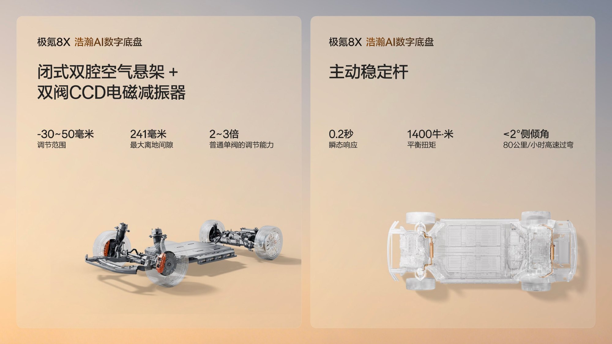 极氪8X配备了先进的浩瀚AI数字底盘,其中包括闭式双腔空气悬架和双阀CCD电磁减震器,调节范围从-30毫米到50毫米不等,最大离地间隙为241毫米。在干燥路面条件下,该车通过麋鹿测试的速度可达到83.6公里/小时;而在湿滑路面上这一数值则降低至76.3公里/小时。