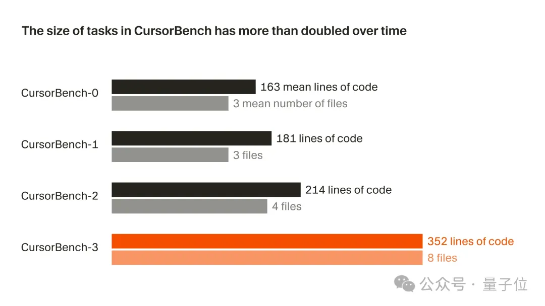 在正确性评估中,无论从代码行数还是平均文件数来看,问题规模从初始版本到当前的CursorBench-3大约翻了一倍。