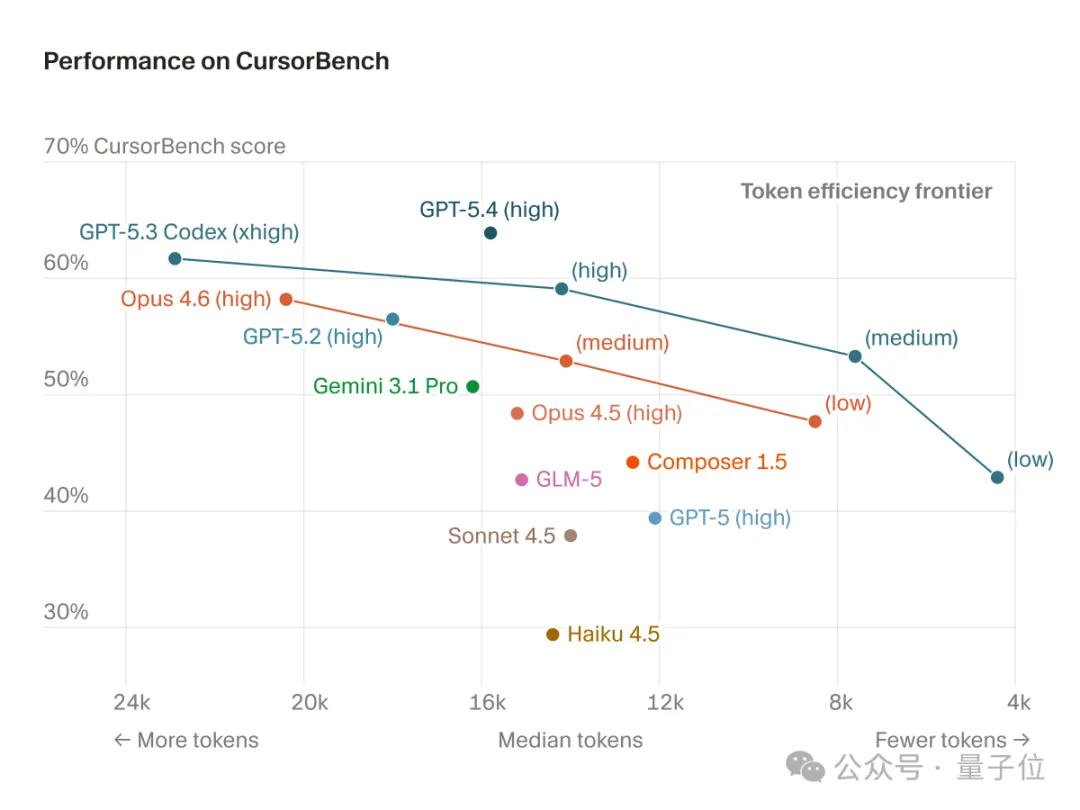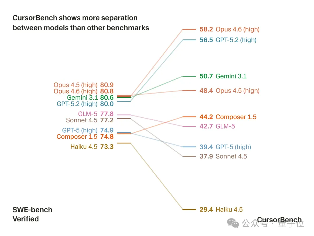 只需对比模型在SWE-Bench和CursorBench上的得分就能看出来了(左边全挤在一起、右边呈阶梯式):