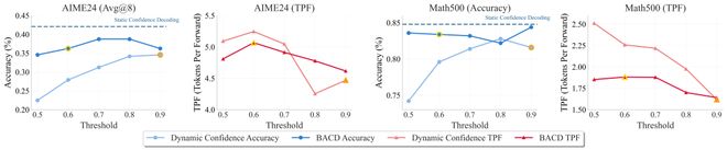 首先,研究团队比较了在不同阈值下的性能与速度权衡。如下图所示,对于 Dynamic Confidence Decoding,随着置信度阈值(Threshold)的降低,模型的性能会出现肉眼可见的衰退。相比之下,BACD 在获得持续效率增益的同时,依然维持了稳定的性能表现。