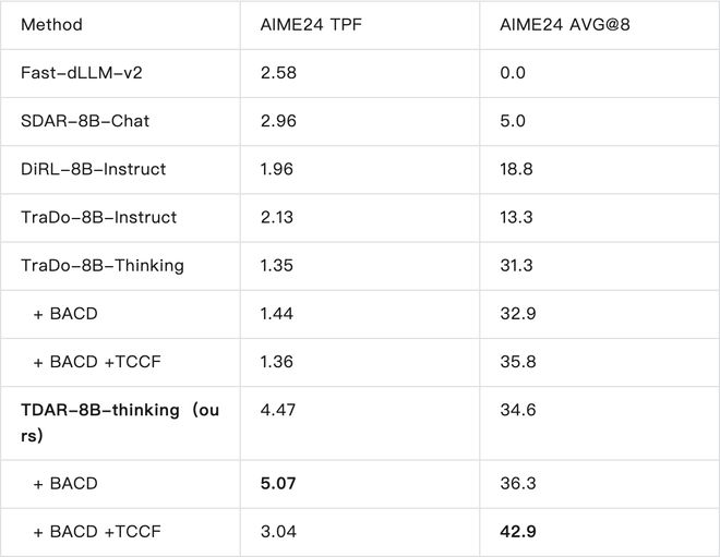 结合 BACD 算法后,该模型的速度进一步提升至3.37 TPF且性能再涨1.6个百分点;叠加TCCF范式后,在AIME24复杂数学任务上的准确率从 36.3% 提升到 42.9%,同时保持了高速度的解码效率。
