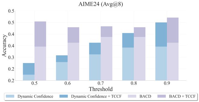在不同的解码算法下应用 TCCF 机制,比较其在 AIME24 上的表现,如下图所示。结果表明,无论是在 Dynamic Confidence 还是 BACD 算法下,引入 TCCF(即从 Coarse 到 Fine 的转换)都能带来一致且显著的性能提升。