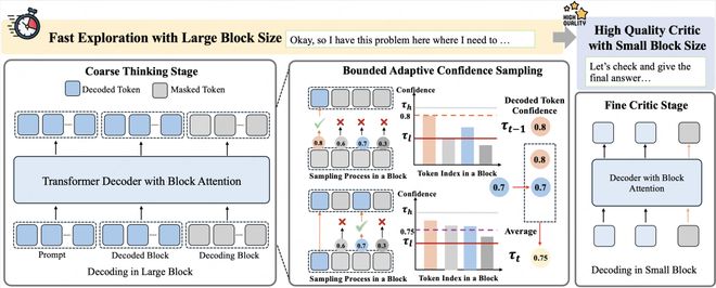 - 此次创新的核心在于双重自适应机制。为了克服现有BDLMs在长链推理中所遇到的问题,研究人员提出了一种统一的TDAR框架,其中包括两个关键设计:有界自适应置信度解码(BACD)和“粗思考细求证”(TCCF)范式。