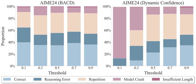 研究团队对 BACD 在不同阈值下,模型输出的行为进行了分析,相比于标准的动态置信度解码,BACD 在不同阈值下表现出极高的稳定性。分析显示,BACD 有效避免了低阈值下的 “模型崩溃” 和 “重复生成” 问题,证明了 BACD 在动态调整去噪步数时具有显著的优越性。