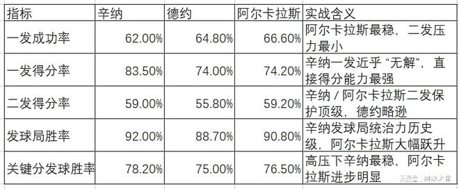 最后一部分将对比辛纳、德约科维奇和阿尔卡拉斯三位顶尖球员在过去一年中的发球表现。通过比较他们的核心数据可以直观地看出各自的特点。