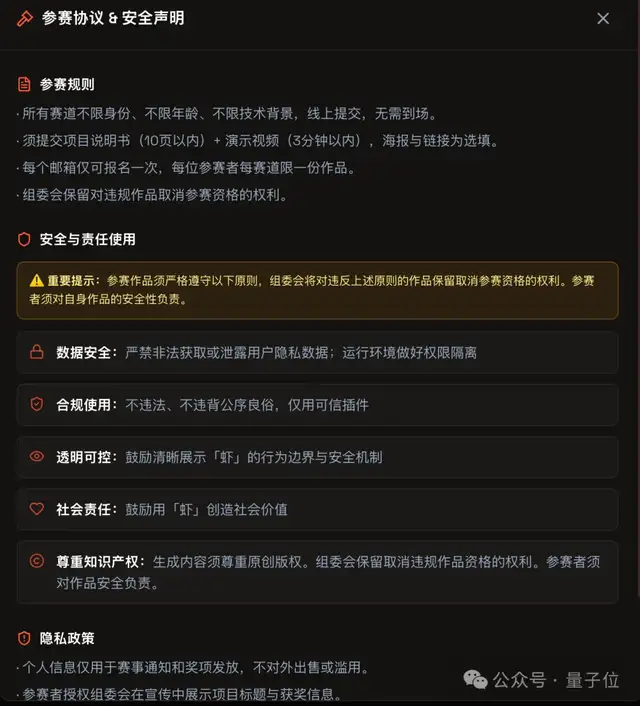 1、数据安全:严禁非法获取或泄露用户隐私数据;参赛作品不得将OpenClaw暴露于公网,运行环境须做好权限隔离。