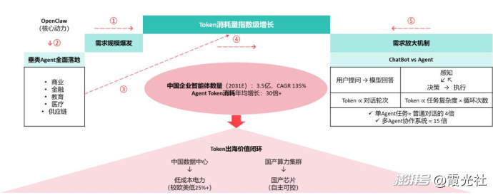 一个智能体完成一次复杂任务所消耗的算力,相当于普通用户与ChatGPT对话近万次。此前有分析道:“早期大模型主要处理问答、文本生成等简单交互,单次对话的Token消耗有限;但Agent像‘数字员工’,能自主拆解任务、调用工具、多轮迭代。比如OpenClaw完成一次自动化办公,可能涉及文件读取、邮件发送、数据处理等十多个环节,每个环节都需要大量Token支撑逻辑运算。”