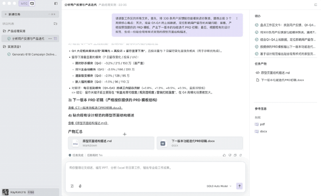 经过短短7分钟的时间,SOLO已经完成了详细的产品迭代初稿。