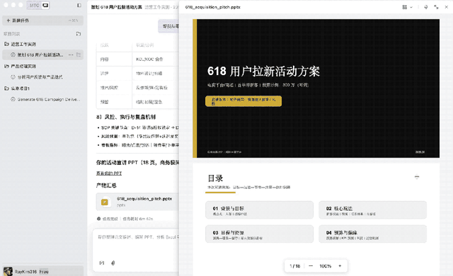 结果显示,策划方案条理清晰,并且生成的PPT页面结构与策划案完全对应,甚至自动插入了符合主题的图片素材。