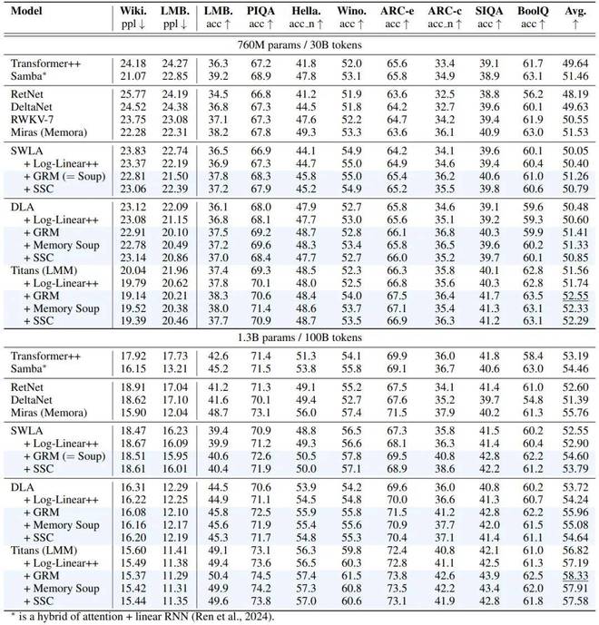 - 在处理长上下文的能力方面有所提升:在语言建模和理解超长上下文的测试中,采用了 MC 机制的循环模型性能得到了全面提升。