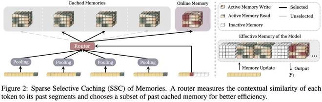 简单来说,与其让 RNN 仅维持一种不断更新的“当前状态”,不如定期对其进行“快照”处理(Caching checkpoints)。这样,在进行信息检索时,模型不仅可以查看当下的在线记忆,还能直接调用缓存中的历史记录,迅速找回过去的相关数据。