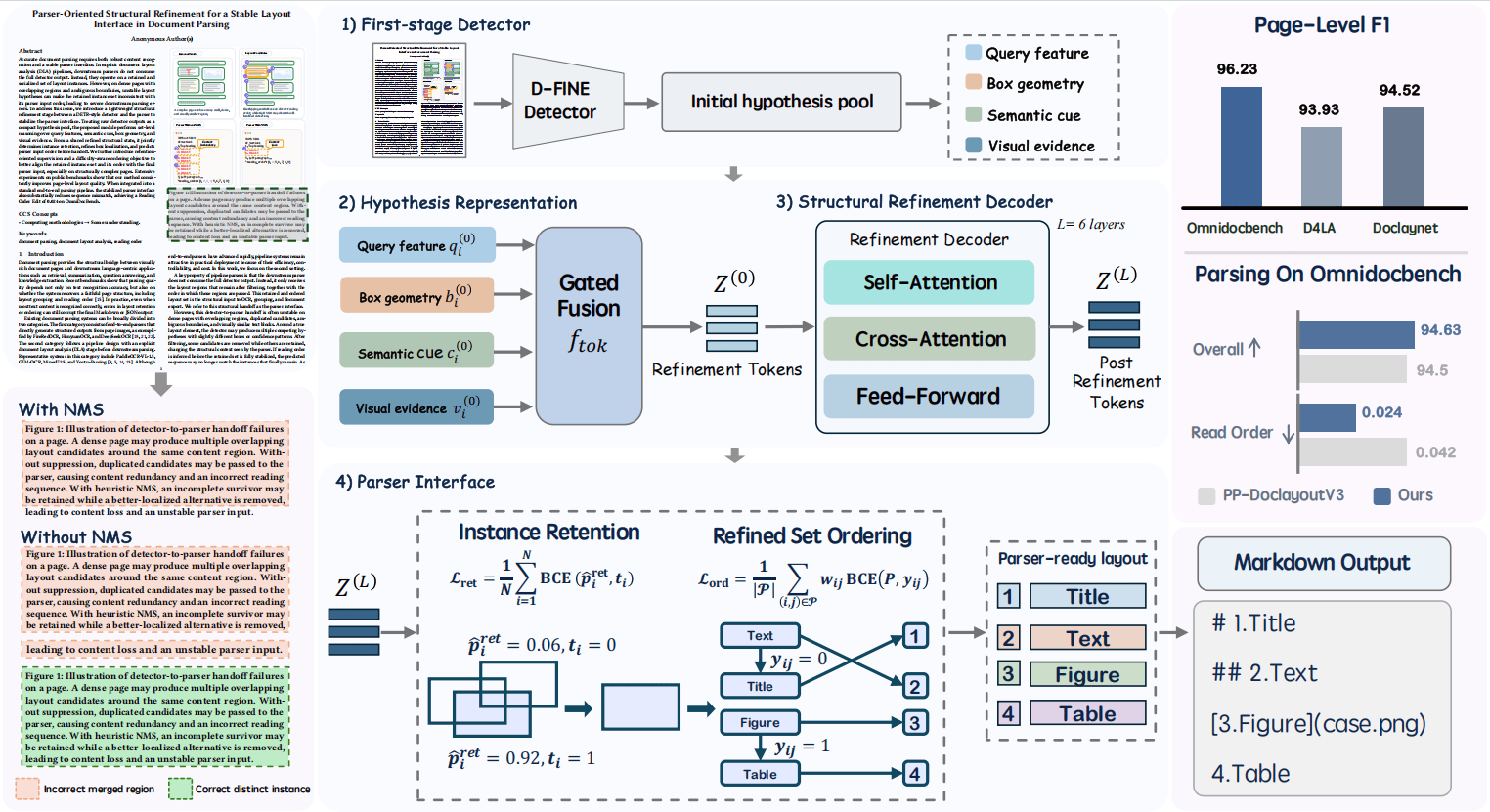 U1-OCR 文档解析的核心逻辑是:输入文档页面图像后,模型先通过第一阶段检测器生成初始候选假设池,再在解析器交接前进行统一结构精修——区别于传统方法依赖NMS决定候选区域去留,我们将检测器输出视为待精修集合,从中构造更稳定的解析器可用版面。其核心技术优势体现在四大关键设计上:
