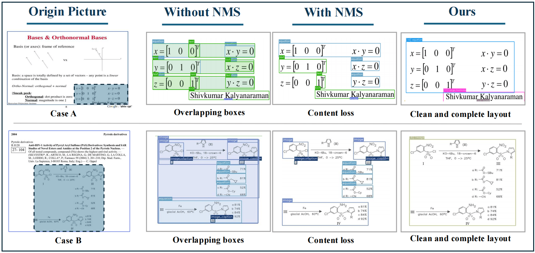 如果不对这些候选框进行适当的预处理就直接送入解析器,则会导致重复信息、结构混乱以及阅读逻辑的中断。传统方法通常通过非极大值抑制(NMS)来解决这一问题,即删除重叠区域中的多余部分,但这种方法在复杂页面中往往不够稳定。
