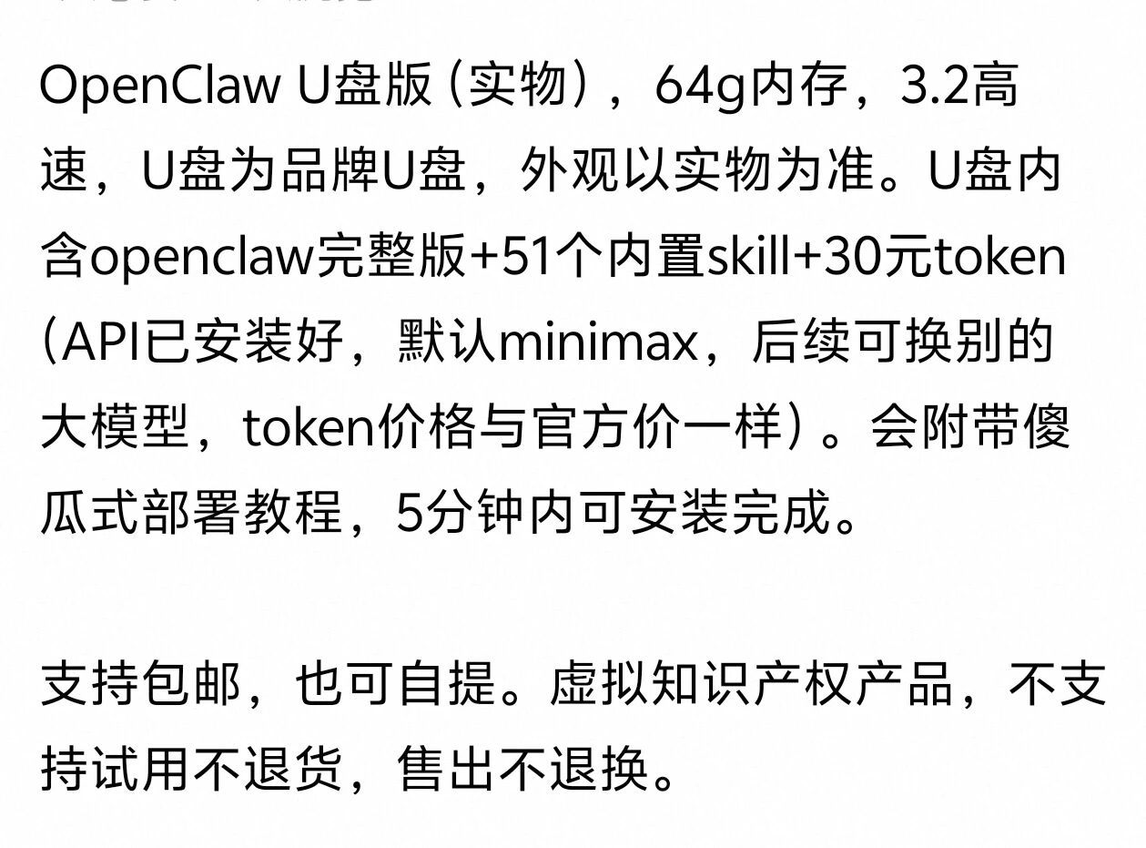 很多商品描述十分诱人:一个64G高速U盘里包含完整的OpenClaw系统、五十多个内置功能,并预先配置了API接口,默认接入MiniMax大模型,还附赠30元的Token和一本简易安装指南,号称五分钟内即可完成全部设置。