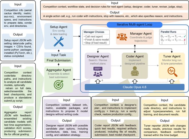 在AIBuildAI系统中,管理智能体扮演着项目负责人角色,不直接编写代码或执行训练任务,而是通过读取磁盘上的实验记录来做出决策。它在协调模式下决定下一步应调用哪个子智能体,在筛选模式下根据训练信号保留有潜力的候选方案,以节省时间和计算成本,并在进展停滞时触发修订或终止。