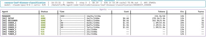接管训练过程,在已有代码基础上专注于性能提升。它采用先快速校准、再决定是否投入的策略:先跑一段简短的热身训练观察学习曲线,再决定是延长当前方案还是进行超参数调整。整个过程在固定计算预算内完成。