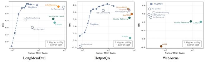 在效用–成本空间里,PlugMem稳定处于更有优势的位置:以更低的单元成本获得更高的决策效用。
