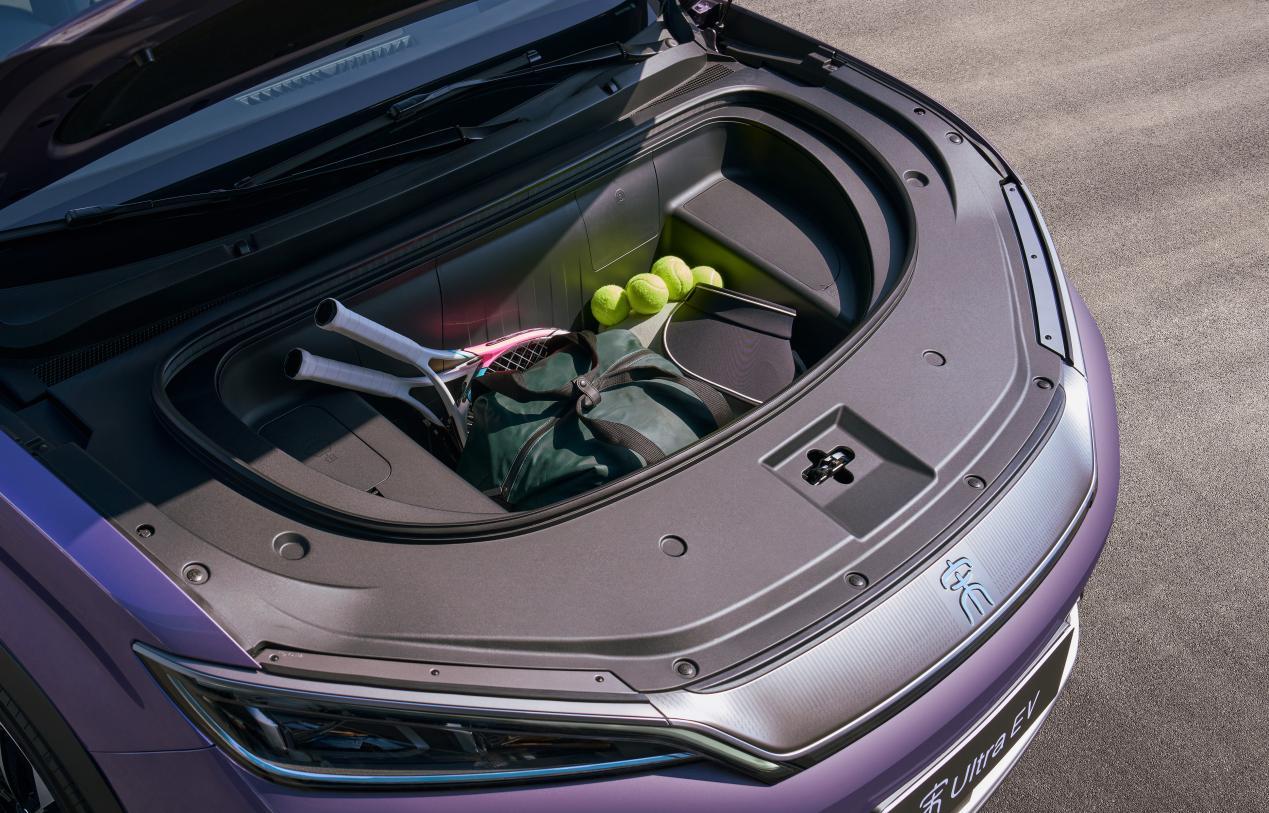 在空间布局方面,宋Ultra EV凭借2840毫米的轴距提供了B级SUV级别的宽敞内部空间。后排腿部空间达到了986毫米,远超许多德系豪华车型的标准;730升的大容量后备箱足以装载六个20寸行李箱和一个婴儿车,并且还拥有150升独立分区设计的前备箱。