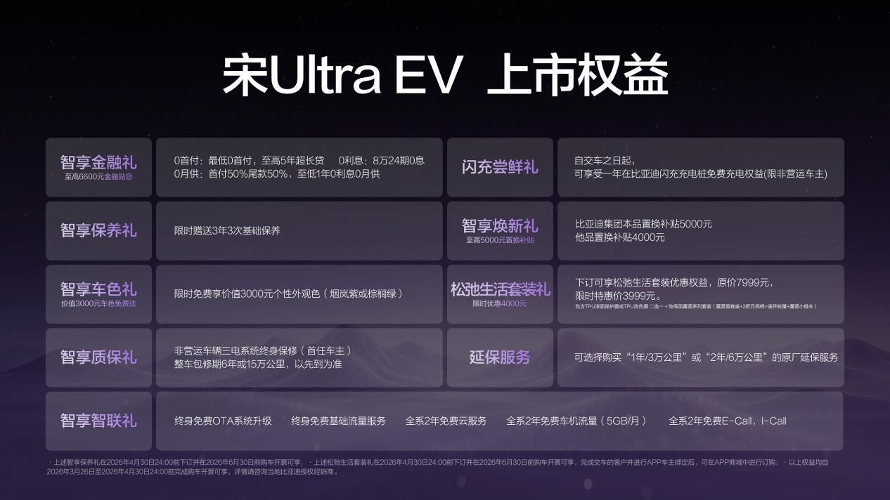 比亚迪王朝正在打造一个涵盖购车、用车到养车全过程的服务体系。宋Ultra EV则提供了包括“零成本购入”、“免费使用”、“无忧养护”等一系列超值优惠,旨在为消费者带来极致的购车体验和全方位的支持服务。