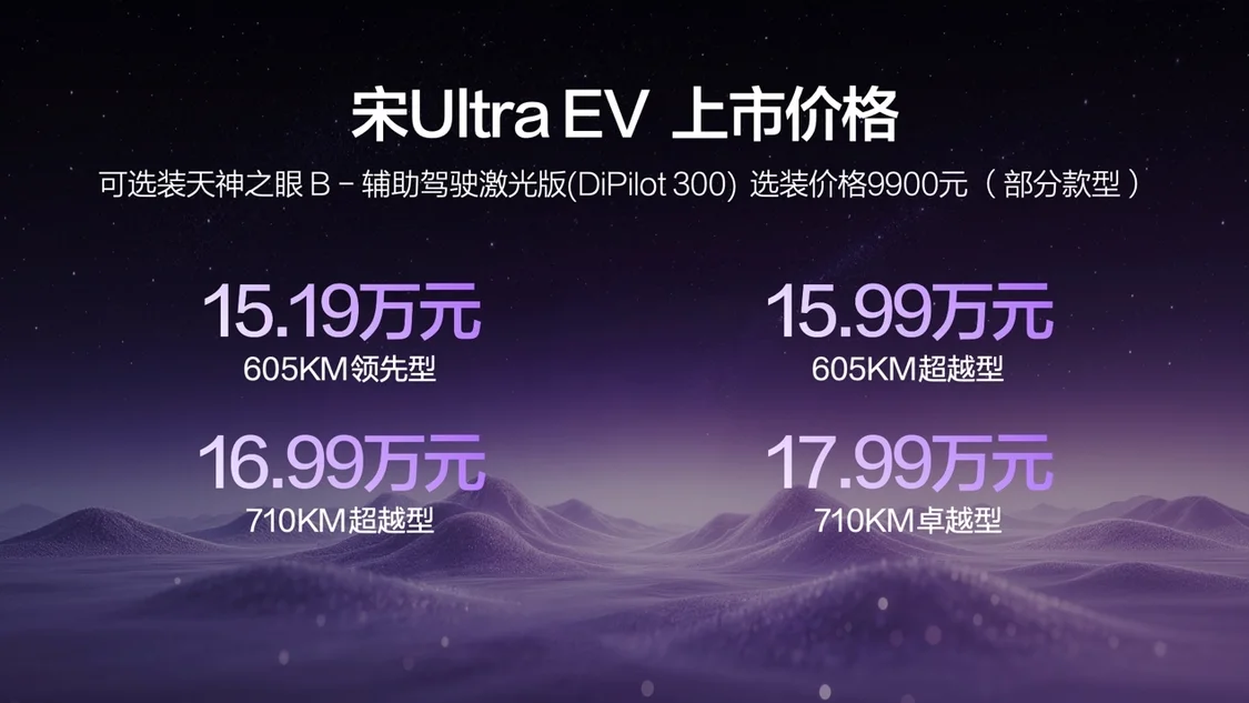 凤凰网汽车讯 3月26日,比亚迪旗下全新纯电SUV——宋Ultra EV正式上市。新车共推出4款配置,售价区间为15.19万-17.99万元。作为宋家族的全新电动化产品,这台车在续航、补能效率以及智能化配置上都有明显提升,整体产品力进一步向中高端市场靠拢。