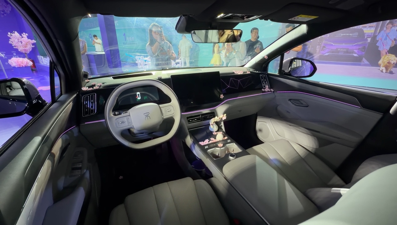 内饰部分,宋Ultra EV主打简约与质感并重。车内配备15.6英寸自适应旋转中控屏、10.25英寸全液晶仪表以及26英寸W-HUD抬头显示,并搭载全新UI 7.0车机系统。整体设计强调留白与层次感,同时在高频接触区域大量使用软性材质,细节如门板纹理、氛围灯以及电子怀挡等,也在向精致化方向靠拢。
