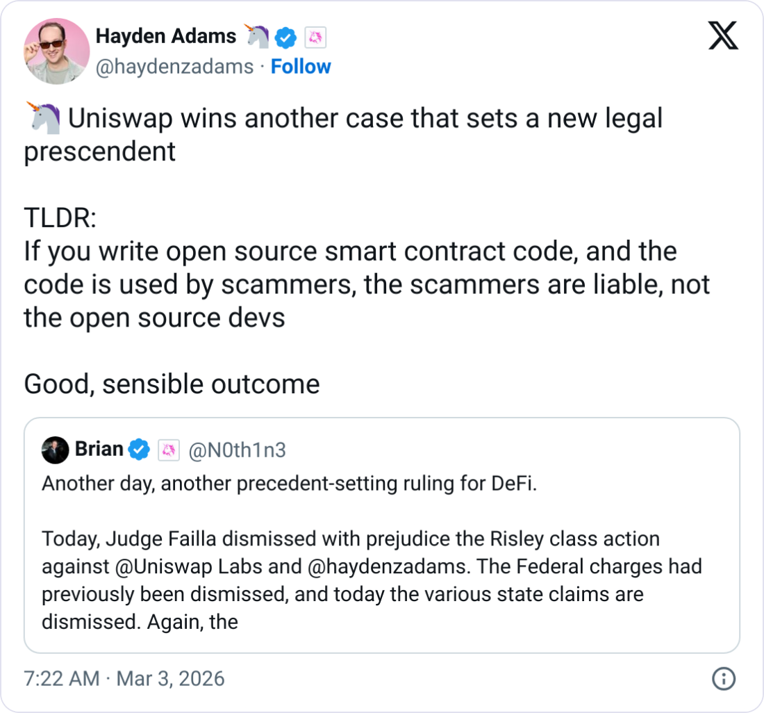 Uniswap 的阿德AMS在其社交媒体账户上发文称,这一判决是一个“良好而明智”的结果,开创了新的法律先例。