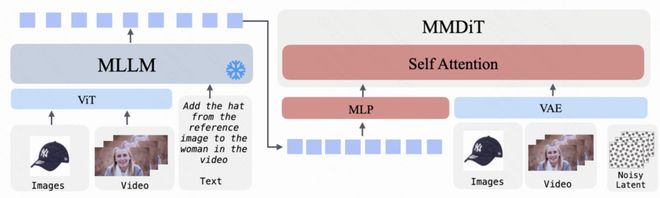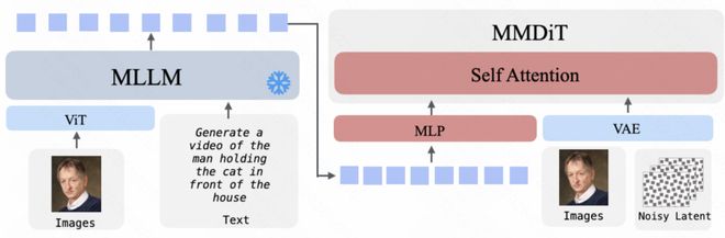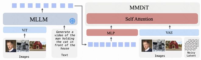 图像至视频的转化过程中,MLLM 负责综合理解输入图像和附加文本说明,并提供语义条件;与此同时,视觉信息与视频潜在变量共同作用于 MM-DiT 的生成过程之中。