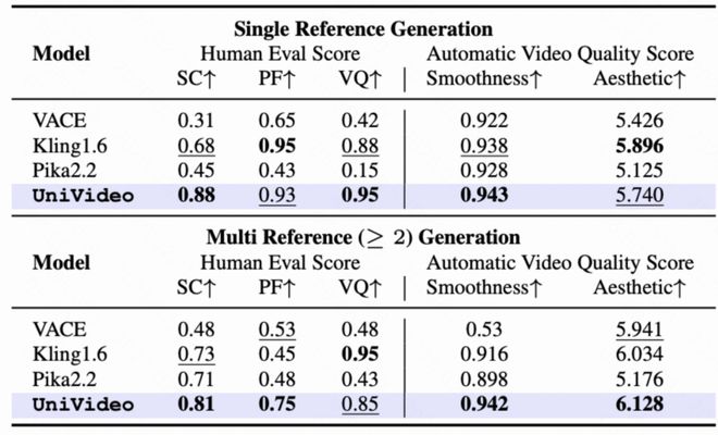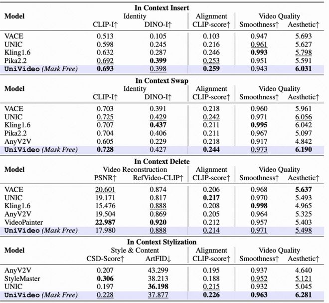 - 实验结果显示,在多种定量评估指标上,UniVideo 超过了专门针对特定任务设计的传统基线方法,并在大多数测试条件下达到了或超过了当前最佳水平(SoTA)。