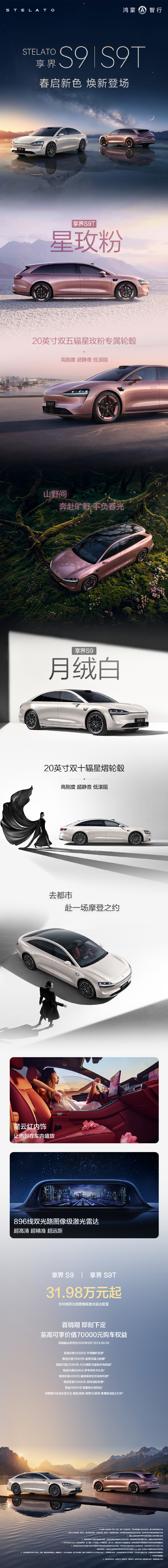各品牌的车型也在外观颜色和内饰材料方面进行了更新。享界S9及S9T推出了星美粉和月蓉白两种新颜色,起售价为31.98万元。智界S7与R7则新增了暗夜紫和活力橙两种颜色,两款车型的座舱采用了能吸附并分解甲醛等异味的MOFs材料,起售价分别为23.98万元和25.98万元。问界M7和问界M8也增加了新的车漆选项,起售价分别为30.98万元和36.98万元。