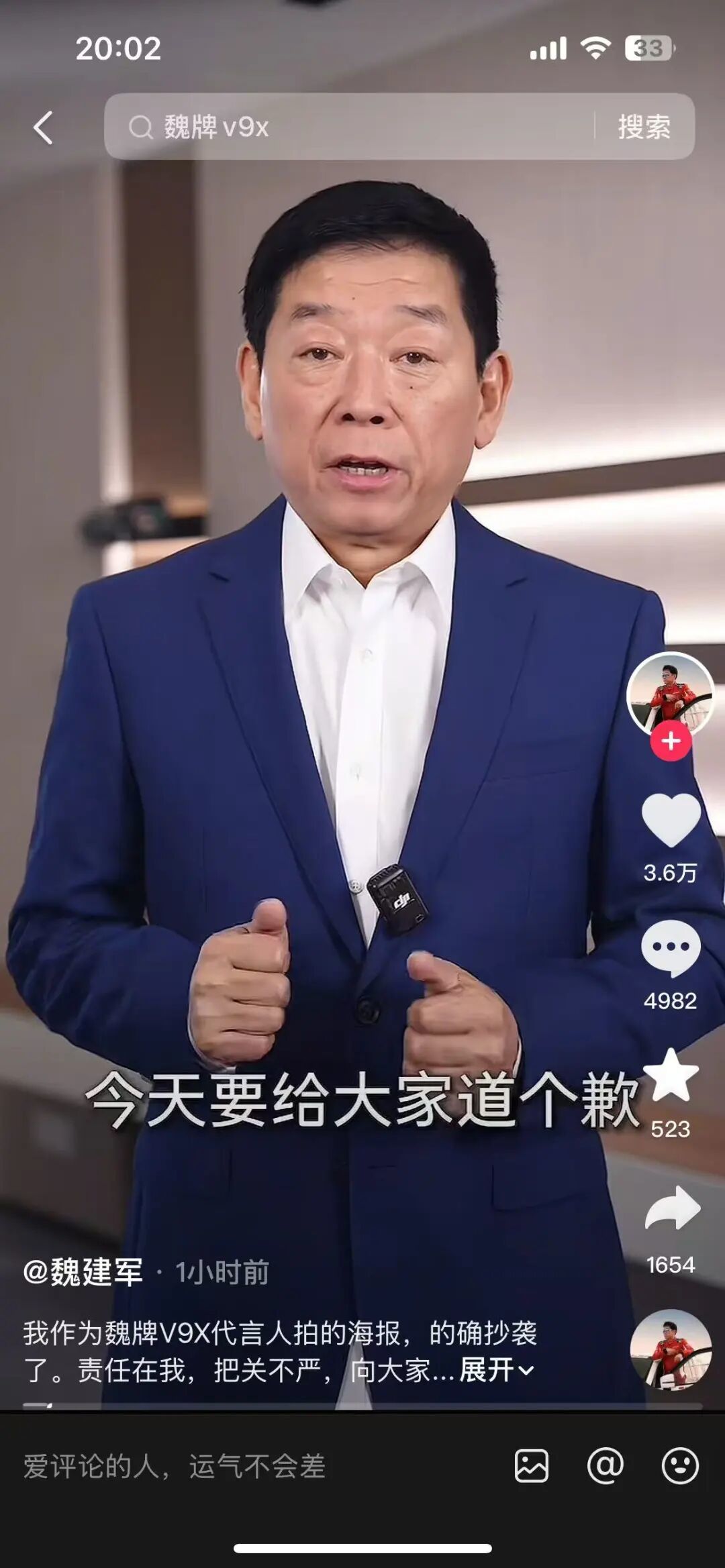 近日,长城汽车董事长魏建军就旗下魏牌V9X新车代言海报涉嫌抄袭一事,在视频声明中正式承认了这一事实并向公众道歉。