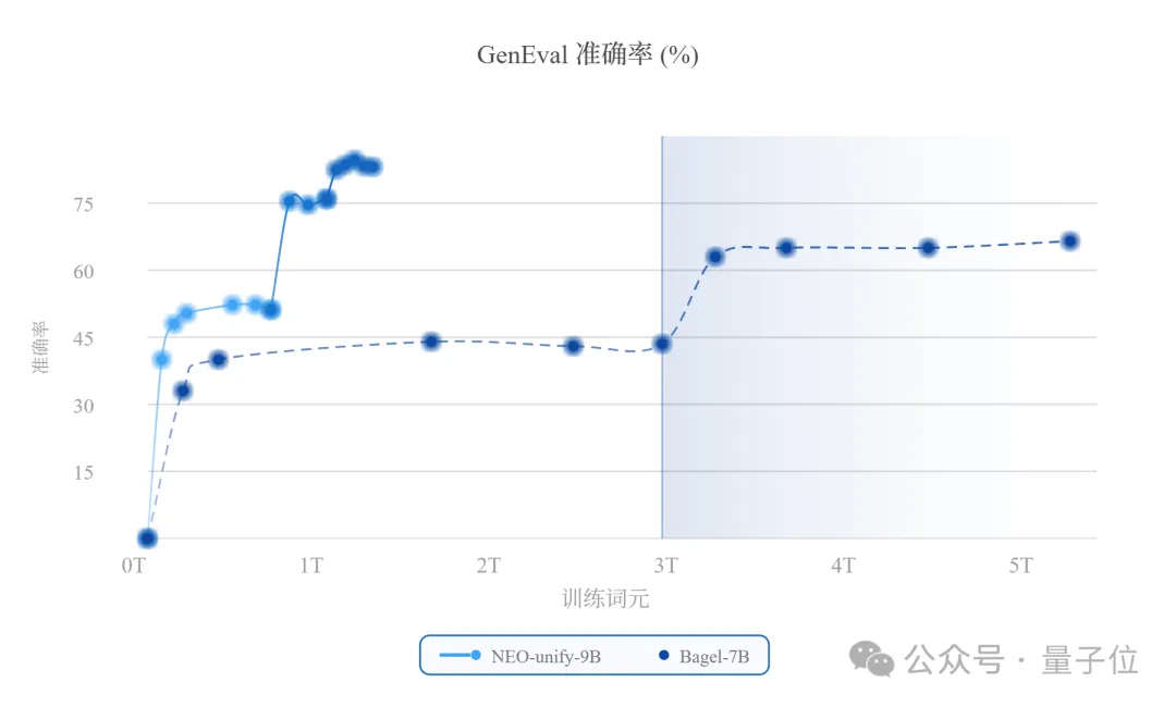 相比于Bagel模型,NEO-unify展示了更高的数据利用效率,在较少训练token的情况下达到了更好的性能。
