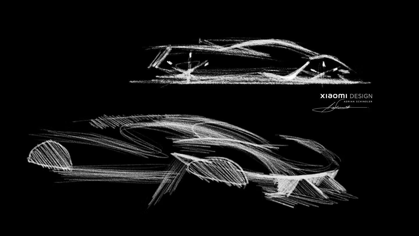 设计理念从最初的几笔勾勒开始逐渐成形,其中包括一个悬浮的水滴状驾驶舱和一条简洁流畅的尾部线条,这些都体现了 Xiaomi Vision Gran Turismo 的核心设计理念。