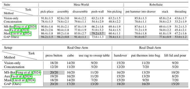如表1所示,在多样的任务设置中,GAP不仅帮助了视觉-本体策略超越纯视觉策略,真正利用模态协同的优势,同时还超越了多种现有的基线方法。