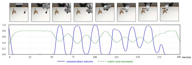 当机器人的任务从一种模式过渡到另一种时,特别是当动作发生变化的时候,这种结合可能会遇到困难。这表明在某些阶段,视觉和触觉之间的配合可能无法达到预期的效果。