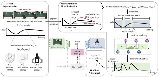 针对视觉模态在运动转变阶段被抑制的问题,研究团队提出了如图2所示的基于阶段引导的梯度调整算法(Gradient Adjustment with Phase-guidance, GAP)。核心思路是:先识别出任务中的运动转变阶段,然后在这些关键时刻动态调整本体觉信号的优化强度,为视觉模态「让出学习空间」。