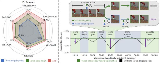 这一现象表明,在需要视觉信息做出决策的关键时刻,传统的视觉-本体策略可能会失效。研究者们进一步分析了可能的原因,发现视觉线索在这些复杂场景中往往不够明显,而本体感觉信号则更为直接有效。