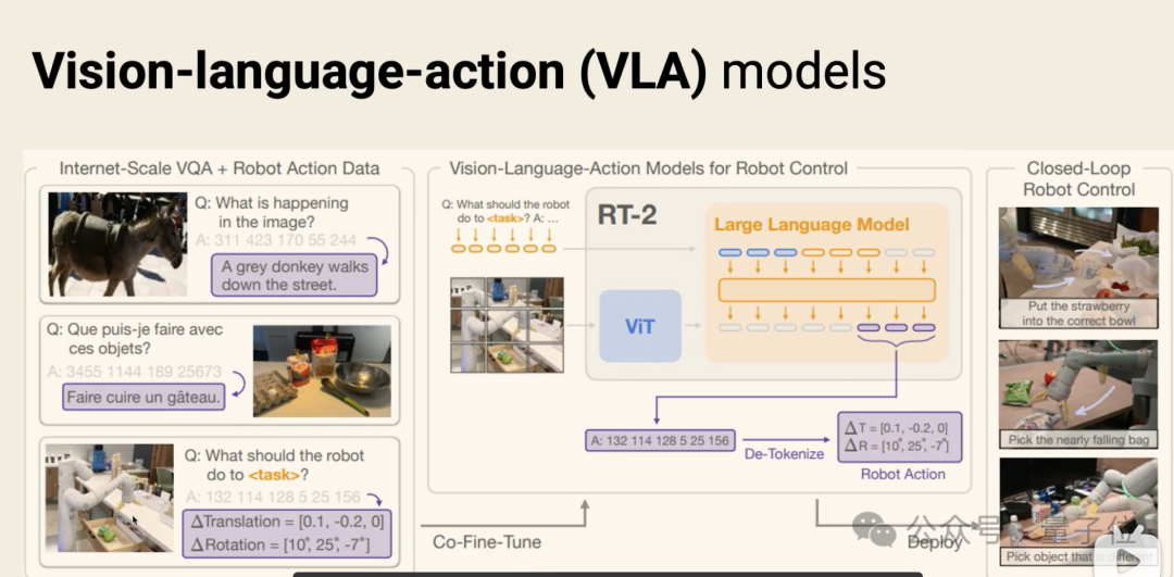 第一代是RT-2,把机器人动作离散化成token,塞进VLM的next-token prediction里。