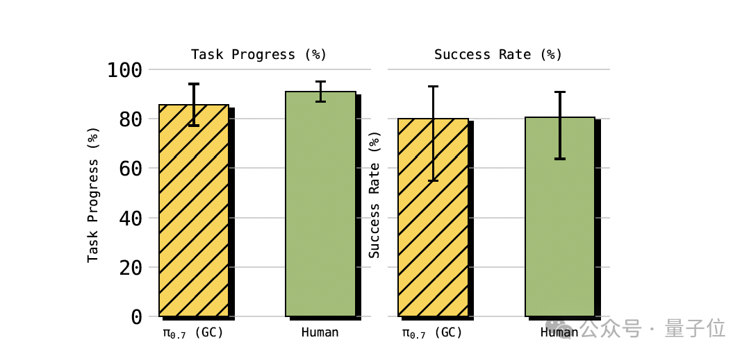 特别是在最难的任务上,π0.7甚至超过了为特定任务设计的专业机器人。