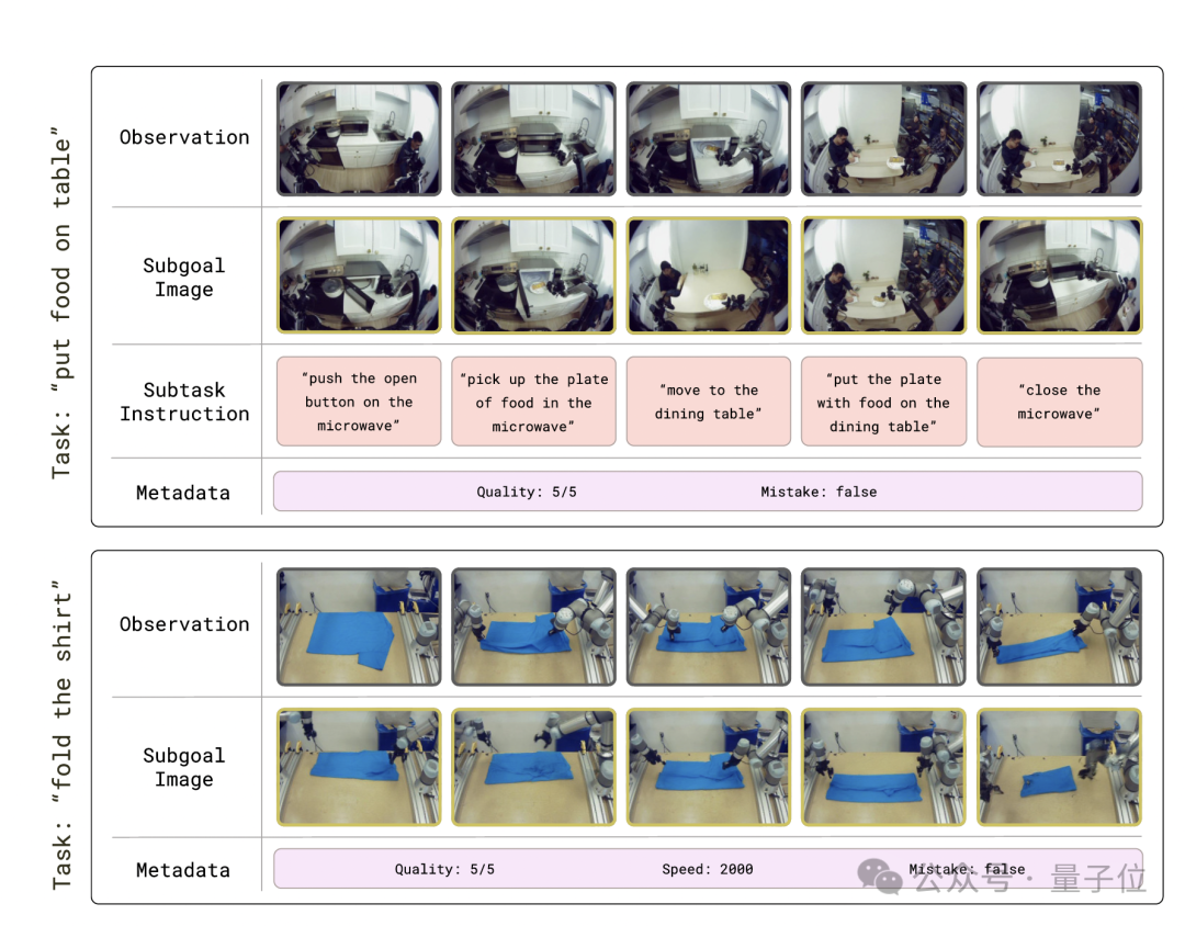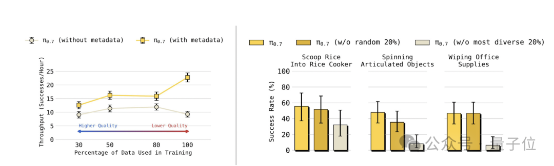 然后分别训两个版本的π0.7,一个加metadata(每条数据打上质量几分、有没有出错、多快完成的标签),一个不加。