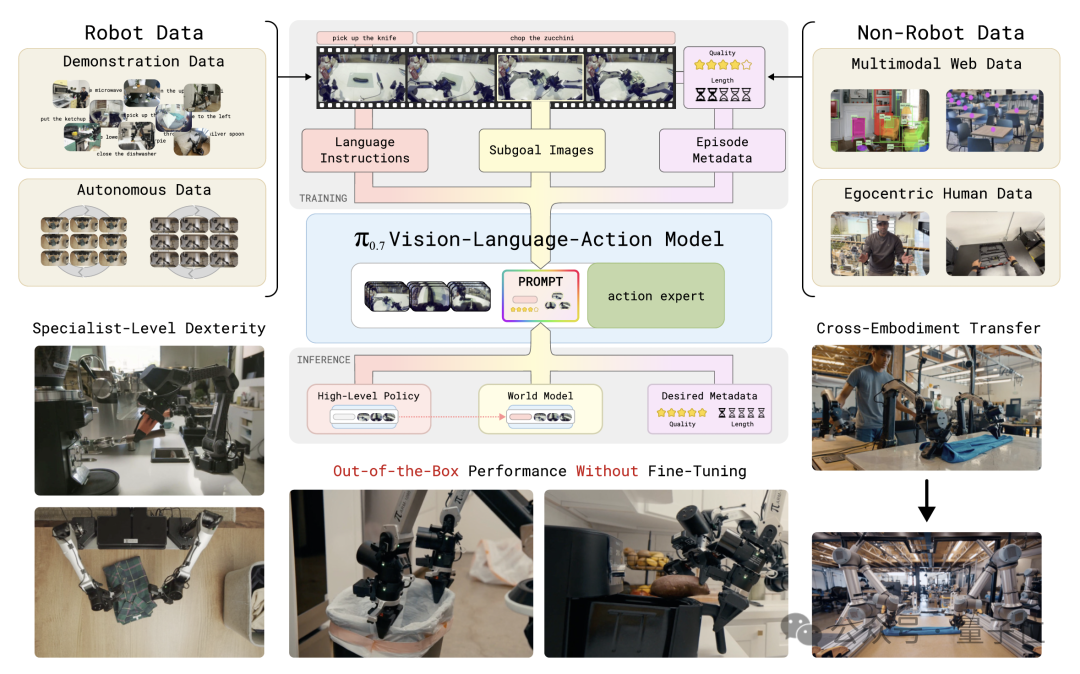 以往的VLA模型在单一任务上的表现良好,但π0.7则通过多层结构化提示(包括任务指令、子任务指令及元数据)提升了模型的学习能力。