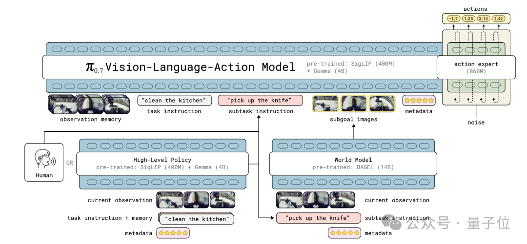 此外,π0.7还站在两篇前作的肩膀上,继承了π0.6的架构底子,以及MEM的多尺度记忆编码器(短期视频memory+长期语义memory)。