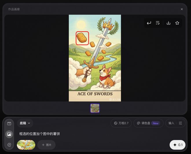 第四步,在输入框里写上你的编辑指令,比如「框选的位置加个薯饼」,点生成,搞定。