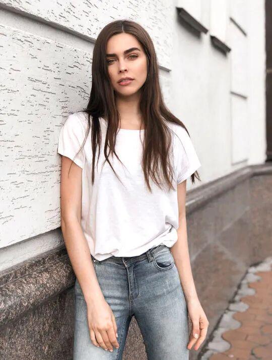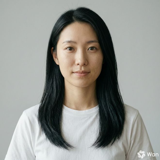 正面半身人像,一位25岁的东亚女性,【脸型的设定】,自然光线,眼神直视镜头,黑色直发披肩,穿白色圆领T恤,背景纯色浅灰,写实摄影风格,35mm镜头,浅景深。