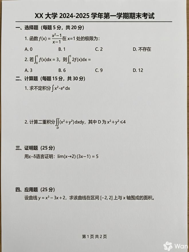 标准A4纸排版,页眉印「XX大学 2024-2025学年第一学期期末考试」,页脚印「第1页 共2页」。
