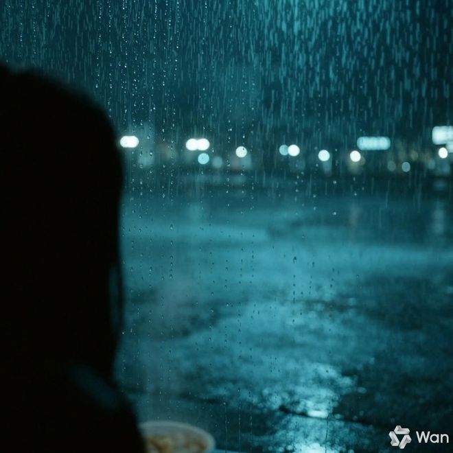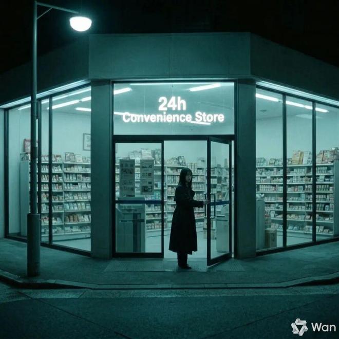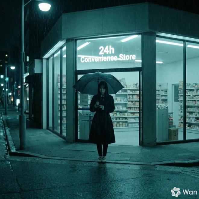 请生成一组8张逻辑连贯的电影分镜序列,讲述以下故事:一个穿黑色风衣的年轻女性深夜走进一家无人便利店,她从货架上拿了一杯泡面,坐在窗边等热水,窗外开始下雨,她看着雨发呆,手机屏幕亮了一下她没接,泡面泡好了她开始吃,最后一张是她吃完走出便利店撑开伞消失在雨夜街道尽头。全程无对白,电影感构图,每张画面的机位和景别有变化(远景、中景、特写交替),统一冷青色调,35mm胶片质感。