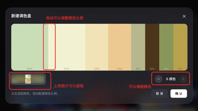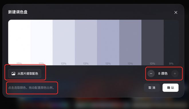 点「新增配色方案」,然后点「从图片提取配色」,上传任意参考图,系统自动提取主色和占比。
