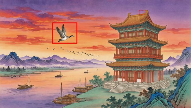 举个栗子,精准框选图中的大雁,并输入指令:将图中框选的大雁移动到虚框位置,并且姿势变成站在屋檐上。