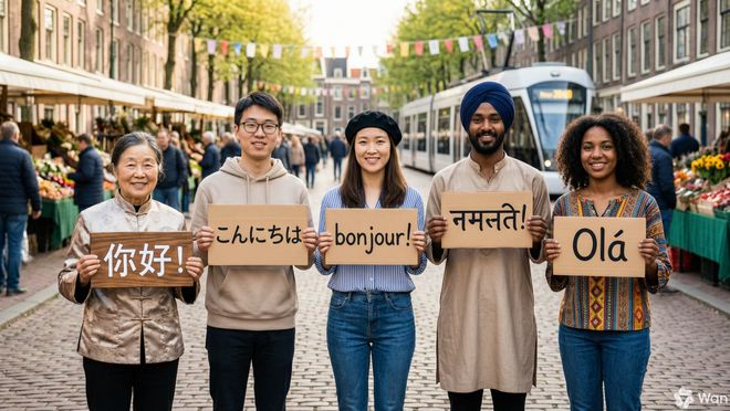 一位面带微笑的、不同族裔的五人小组,在阿姆斯特丹繁忙的、铺有石板的步行市场街道上,面向镜头,肩并肩站成一排。从左到右:一位老年中国女性,穿着传统的丝绸图案夹克,双手拿着一个木牌,上面用白色汉字写着「你好!」;一位年轻的日本男性,戴着眼镜,穿着米色连帽衫,拿着一个纸板标志,上面用黑色日文写着「こんにちは」;一位年轻的法国女性,戴着黑色贝雷帽,穿着条纹衬衫,拿着一个纸板标志,上面用黑色法文写着「bonjour!」;一位年轻的印度男性,戴着深蓝色头巾,穿着米色突尼克衫,拿着一个纸板标志,上面用黑色印地语写着「नमस्ते!」;一位年轻的非裔女性,留着蓬松的卷发,穿着色彩鲜艳的图案上衣,拿着一个纸板标志,上面用黑色葡萄牙语写着「Olá」。背景是典型的荷兰运河房屋、一辆行驶中的阿姆斯特丹有轨电车、色彩鲜艳的街道旗帜和繁忙的市场摊位,柔和的日光,景深较浅。