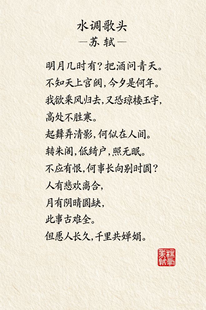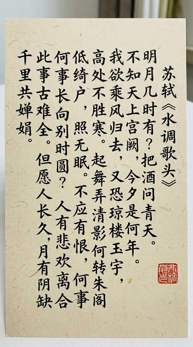 一张竖版宣纸质感的书法卡片,毛笔楷体风格,居中排列,内容为苏轼《水调歌头》全文: 明月几时有?把酒问青天。不知天上宫阙,今夕是何年。我欲乘风归去,又恐琼楼玉宇,高处不胜寒。起舞弄清影,何似在人间。转朱阁,低绮户,照无眠。不应有恨,何事长向别时圆?人有悲欢离合,月有阴晴圆缺,此事古难全。但愿人长久,千里共婵娟。 背景淡米色宣纸纹理,右下角一枚红色印章。
