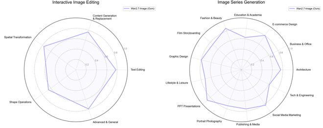 Wan2.7-Image支持交互式编辑(文字编辑、空间变换、内容生成和替换),多图像生成能力覆盖时尚美容、平面设计等多领域,堪称六边形战士。